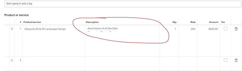 Buy now. I have many Products or Service Templates set up with Full Descriptions in QuickBooks when I invoice clients. Today, while filling in a new invoice I selected my standard Product/Service and noticed that the DESCRIPTION BOX is not only showing two lines at a time. I can't even select all with my mouse to copy and paste the full description. The only way I can edit or even read what is in the description is my using my arrow keys on my keyboard. This is kind of a major issue for me for invoicing and constantly edit and revised these descriptions based on the project. Does anyone know of a way to make this work properly? I've already sent a Feedback Message to QuickBooks, and I spoke with a representative. Her advice was to just write the description in a Word or Text file and then past it into the DESCRIPTION BOX. As you can imagine, this is not ideal. Attached is a photo.