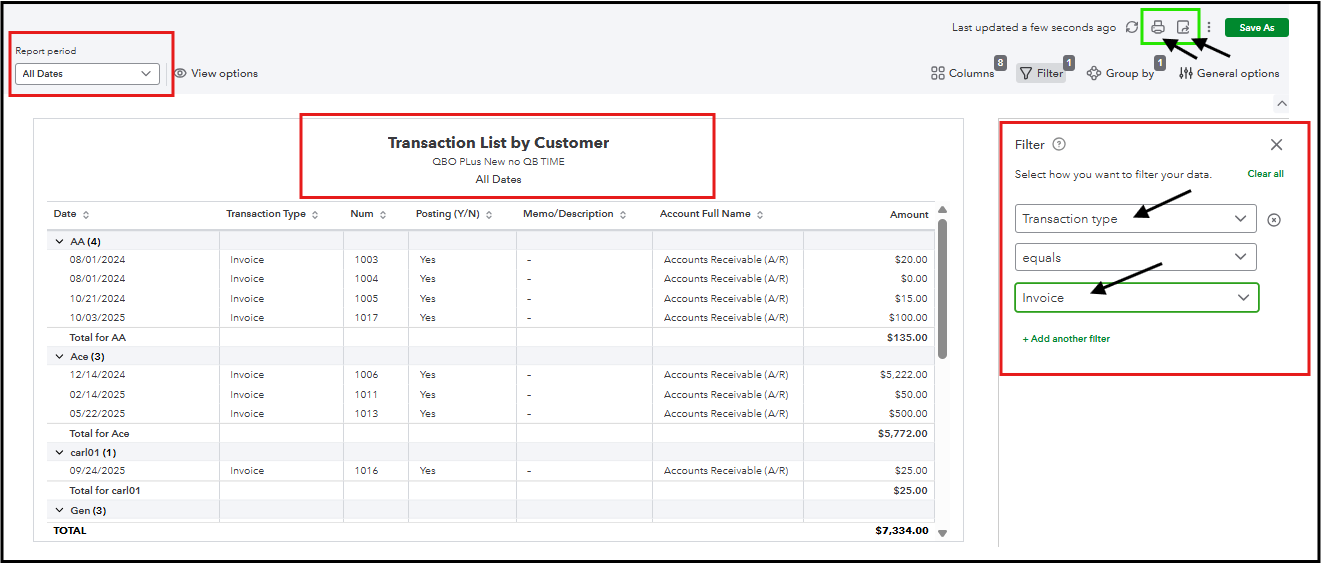 We can generate the Transaction List by Customer report, which serves as a starting point for this task. It includes all transactions for each customer, allowing us to filter and sort by recent dates and invoices.