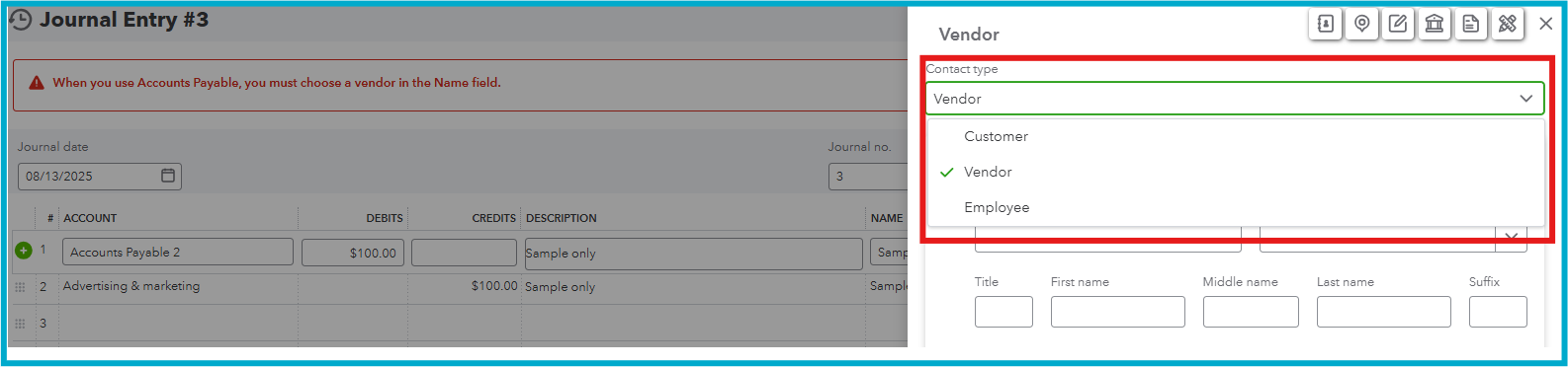 You can't post an accounts payable (A/P) journal entry (JE) in QuickBooks Online (QBO) without a vendor name, Gottalovett-Tropicals.