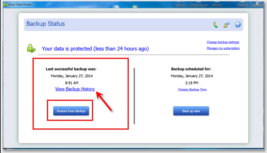 - Choose View Backup History from the Main Intuit Data Protect window.