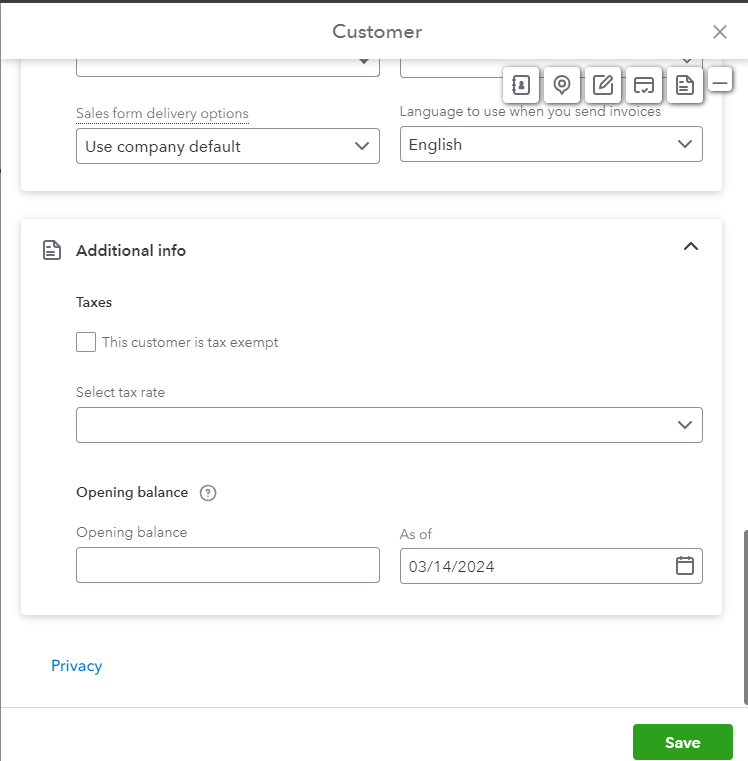 Once done, let's go back to add a customer and check the Additional info area where Taxes can be managed for that customer.