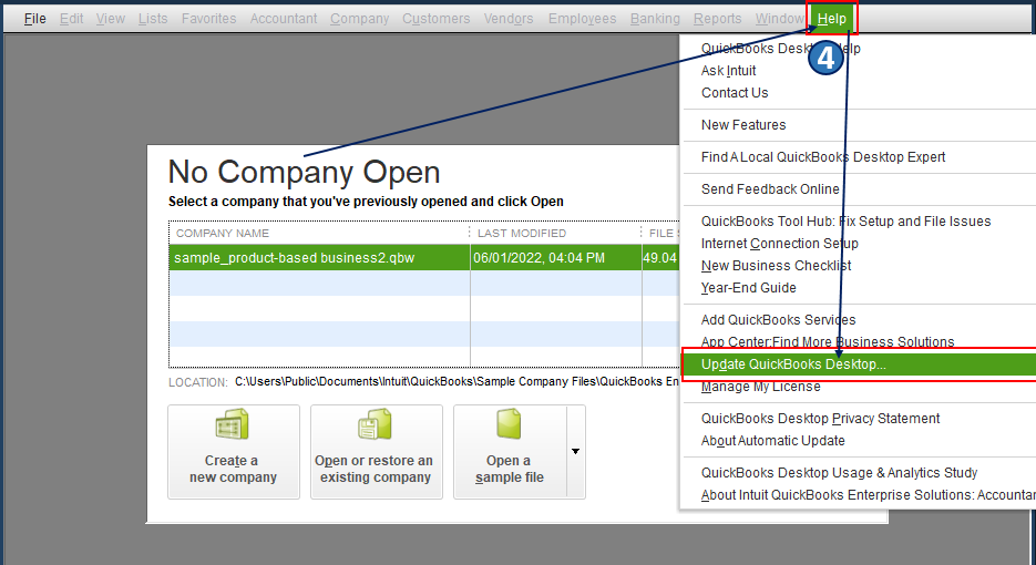 With that, based on your description and screenshot above, you may have outdated QBDT software that's why you're unable to complete your deposit and tasks using the Bank Register/Account page. To fix this, you'll want to ensure your QBDT is updated to the latest release. This way, we can guarantee the program is running with the newest fixes and patches. I'll show you how to do a manual update below.