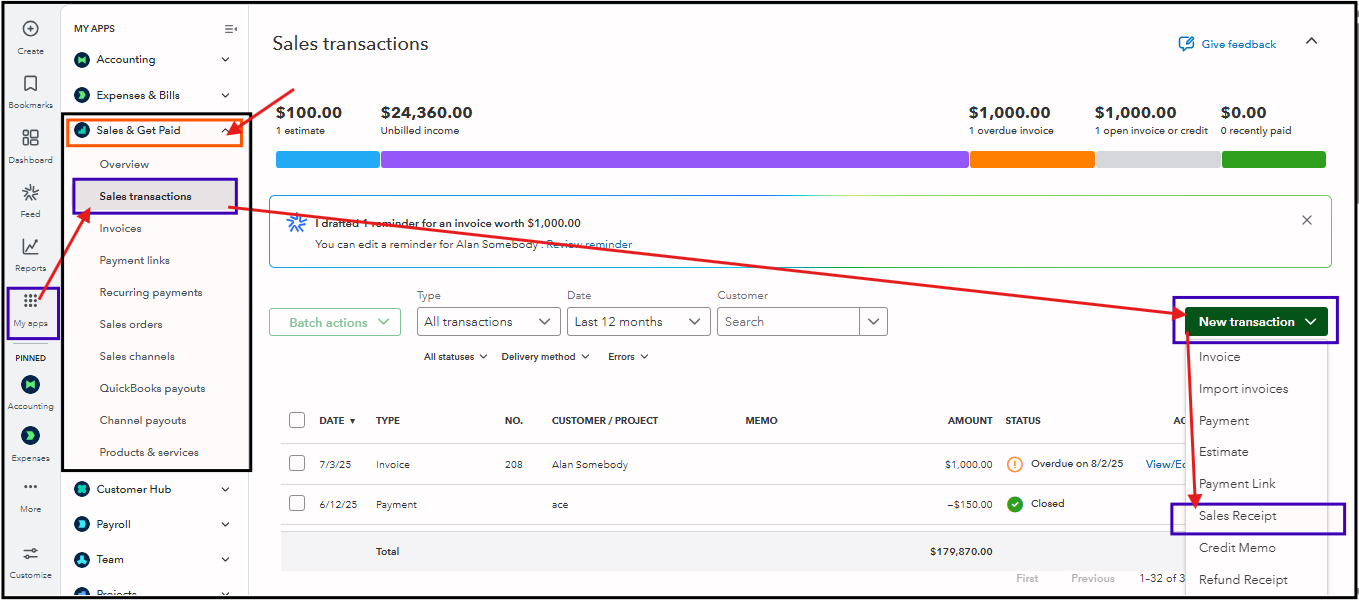Yes, you are right that the Sales Receipts aren't available under the Sales & Get Paid tab. However, we can create a new sales receipt either from the main + New button at the top of the dashboard or by navigating to the Sales Transactions tab.