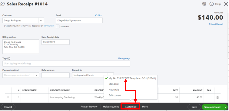 On the Sales Receipt page, simply click the Customize option, then choose the template. Please see the screenshot below for visual preferences.