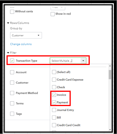 We can run the Transactions List by Customer report to locate the invoices and their payments.