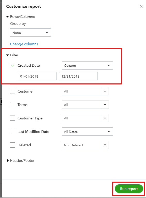 The generated report will show all customers whose records were created in QuickBooks Online during the year 2018. You can adjust the date range as needed.