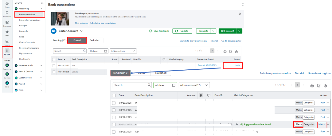 Since your deposits were matched incorrectly, undo the transaction from the Posted tab to bring the entry back to the Pending tab. This way, you can match them again to the correct invoice transaction. To do this: