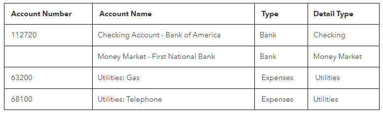 If you organize your accounts by number, add an Account Number column. Or skip this if you don’t use them. If you have a sub-account, add it in the Account Name column in this format: Main account: sub-account. For example, Utilities: Gas.