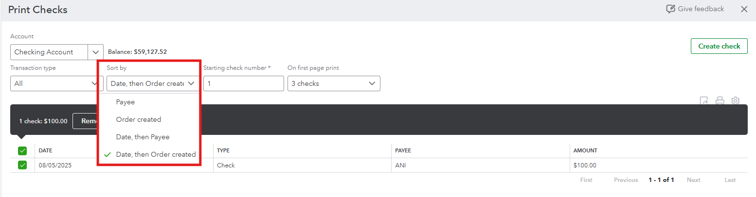3. Under the Sort by dropdown, choose how you will sort out the sequence of your checks. Either according to PayeeOrder createdDate, then Payee or Date, then Order created.