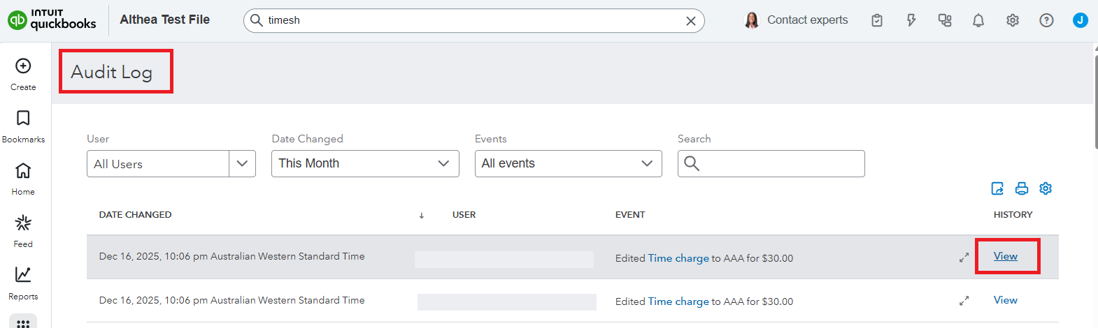 3. On the Audit log page, locate the edited Time charge and click View.