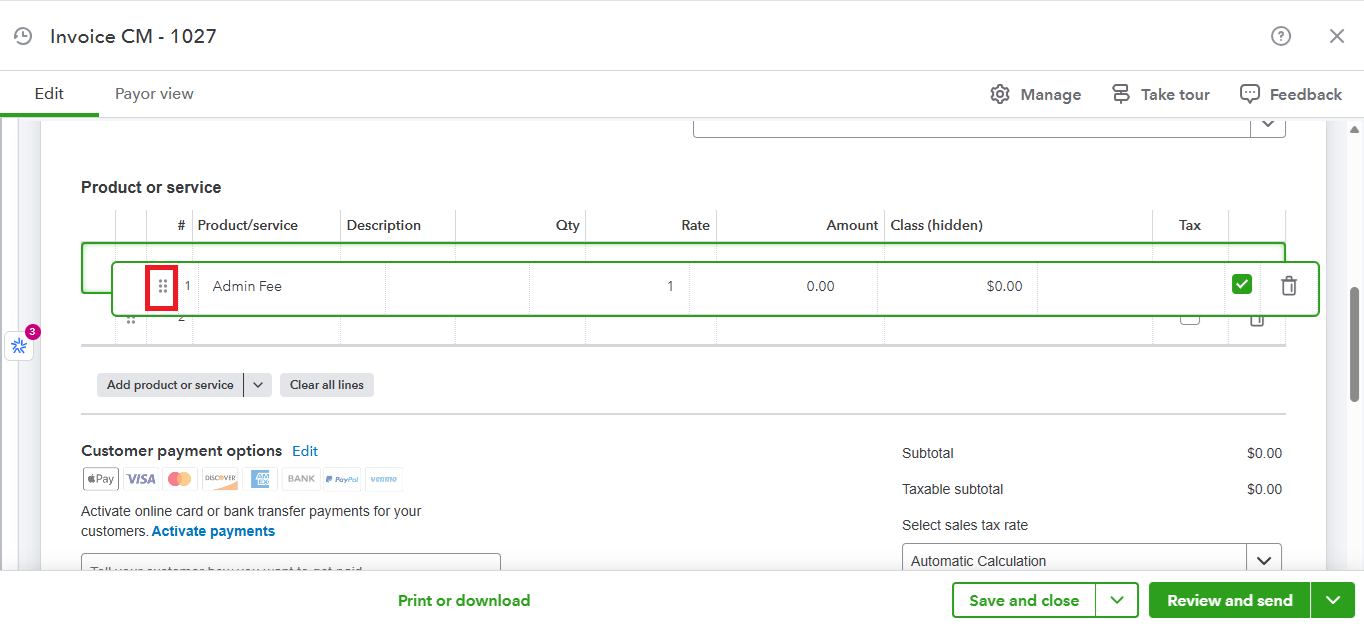 However, if you've already added the billable expenses and need to move the Admin Fee to the top, you can click the grid icon (three stacked dots to the left of the line item) and drag the line item to the desired position.