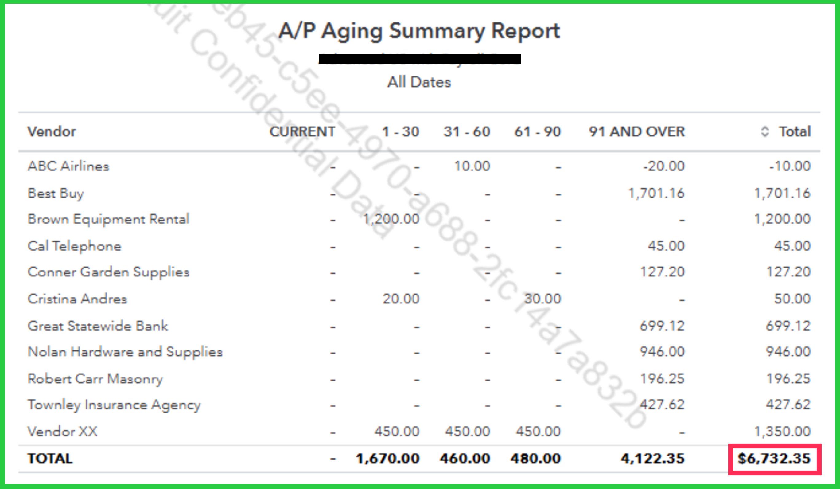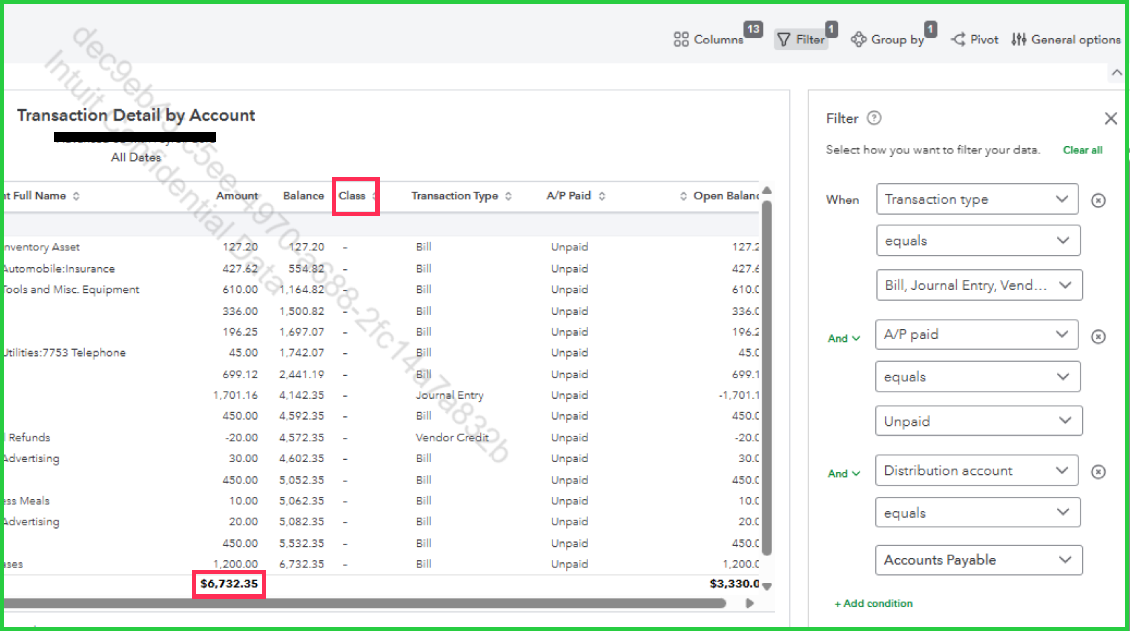 Once done, compare the Amount from the Transaction Detail by Account report with the Total or Amount from the A/P Aging report; they should match. Lastly, be sure to align the Report period on both reports for the best results.