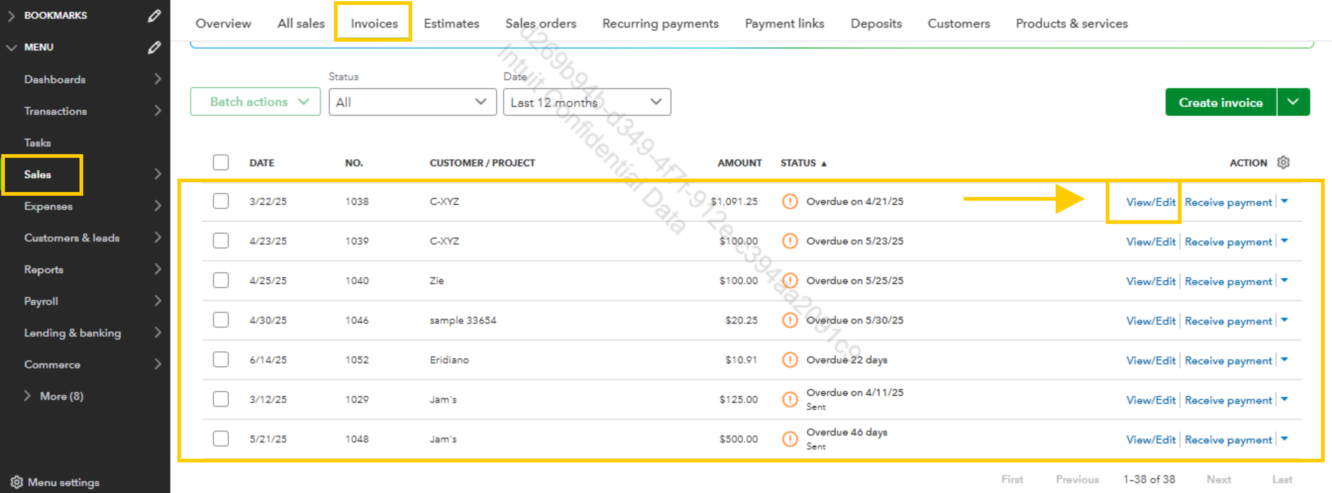 - Open the invoice that does not show the invoice number by clicking View/Edit.