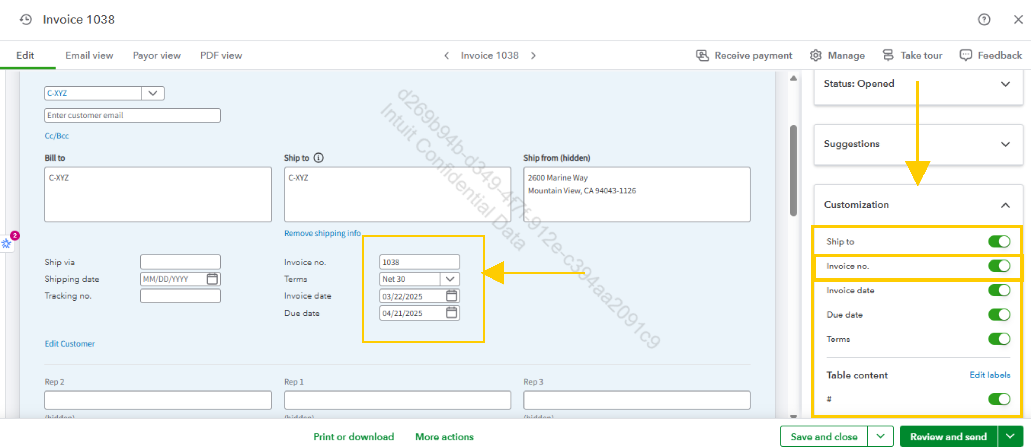 - In the customization options, look for the toggle or checkbox labeled Invoice number and ensure it is turned on or checked.