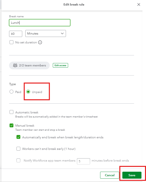 To the payroll entries showing unpaid lunches as paid, you will need to manually edit their working hours if you have QuickBooks Time, or when you run payroll before submitting, to avoid salary overpayment.