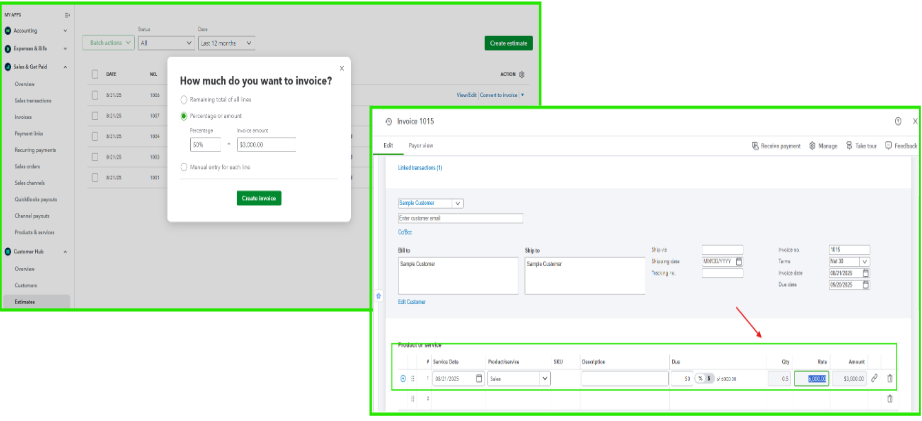 If you need to update or adjust details related to an estimate tied to a percentage-based invoice, we can delete the invoice and the estimate and recreate them. However, this can only be done if the invoice hasn’t been sent to your customer yet. To avoid having to redo this, we recommend double-checking your estimate details before converting them into an invoice.