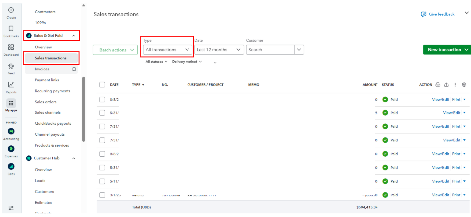 To show or review all the payments made into your account, you’ll have to navigate to the Sales Transactions page and set the filter Type to All Transactions. I’ve included a screenshot for reference.