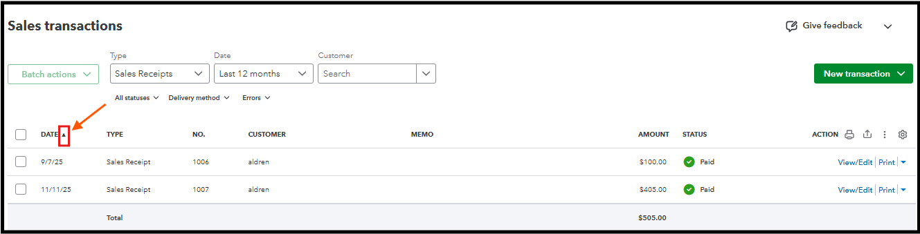 On the other hand, is this issue from the receipts page? Do the receipts show the old ones on the top instead of the new ones? If this is the case, you can click the arrow button beside the date to change the order. See the screenshot below for your visual reference:
