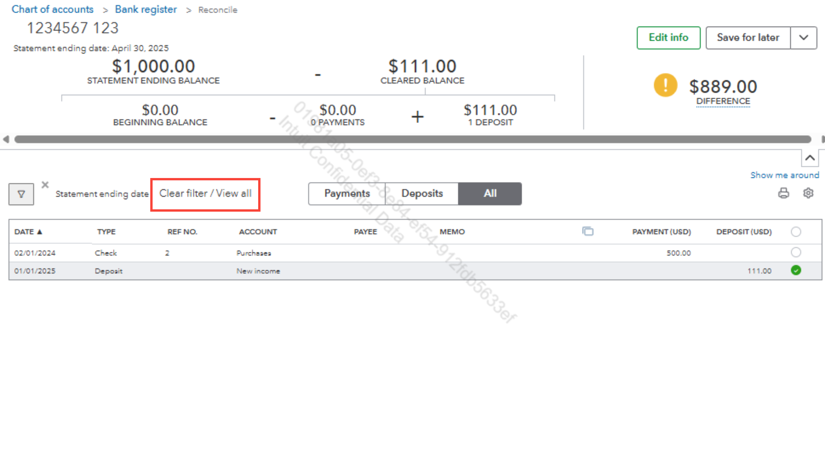 The reason you can't reconcile for the month of May is due to hidden transactions. To address this, let's adjust the filter settings to display and review all transactions.