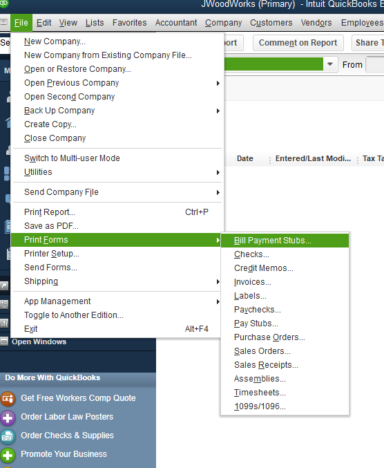 1. Go to the File tab, select Print Forms, and choose Bill Payment Stubs.