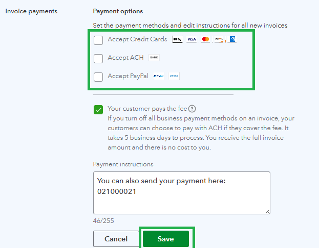 - Once there, locate the Invoice payments section and click the pencil icon.
