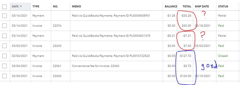 Issue: Starting around the beginning of March 2021, QBO stopped automatically making the convenience fee invoice. In the attached picture, you can see that this customer made online payments with a credit card. In February (blue circle), you can see a convenience fee invoice. In March (red circles), it stopped and the payment is now considered an over payment. Please fix this QBO!