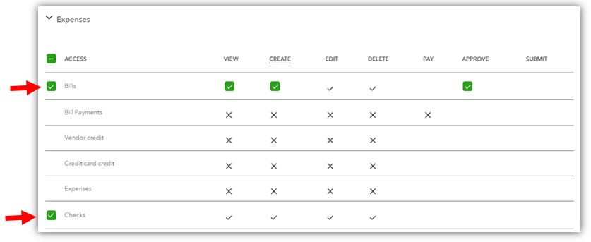 In QuickBooks Online Advanced, users can view, create, and partially edit bills. To let them print checks, you'll need to give them full access to view, create, edit, and delete checks. At this time, you can't customize the access for checks.