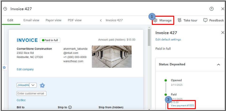 To correctly identify the payment transaction that needs to be voided or deleted, locate and open the invoice that triggered the duplicate deposit issue. This will allow them to trace the payment transaction and either void or delete it.