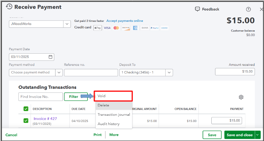 Right, the invoice is not visible as an open A/R record because you've marked it as deposited If you are referring to voiding the payment transaction when you mentioned voiding A/R, you can do so and directly match the open invoice to the bank transaction. Allow me to provide more information for your complete guidance.