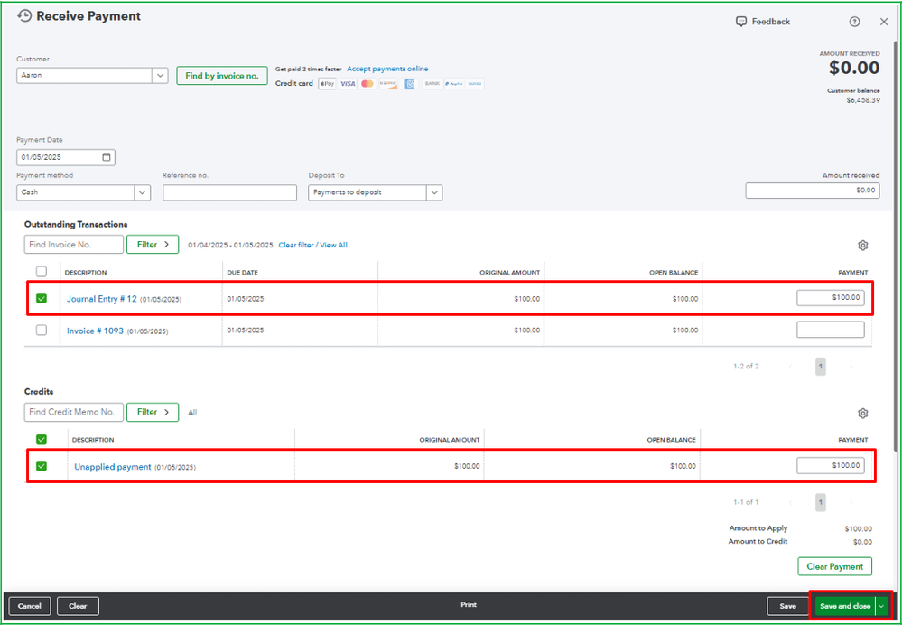 Now the previous payment will show as an unapplied entry. In this, we'll have to match this to the JE we recently created using the Receive Payment option. I added a visual reference below.
