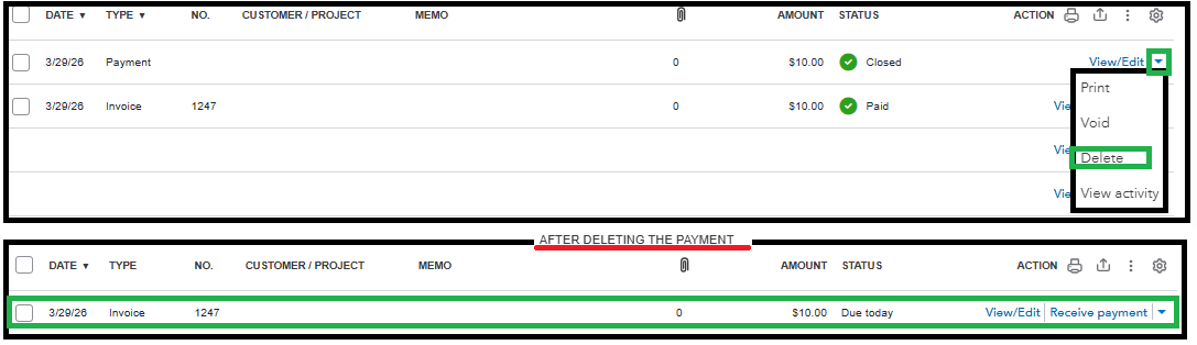 Welcome to the Community forum, @elitepiers3. You can remove a payment linked to an invoice by heading over to the Sales Transactions page. Locate the specific payment and click the dropdown menu, then select Delete.