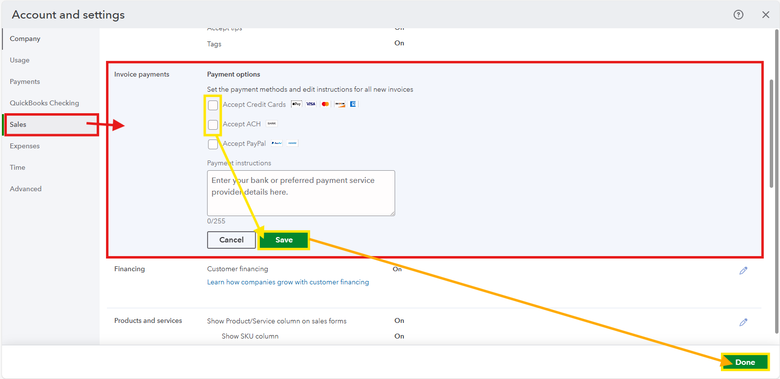 While we're unable to edit the Payment Methods under the Payments, we can still disable ACH and Credit card payments from the Sales section. Here's how to do that: