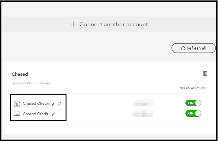 Also, ensure that both the "Savings" and "Main" bank accounts are linked correctly to your QBSE. To check if either bank account is missing or not properly synchronized, you can click the Gear icon and select Manage accounts to see your bank accounts.