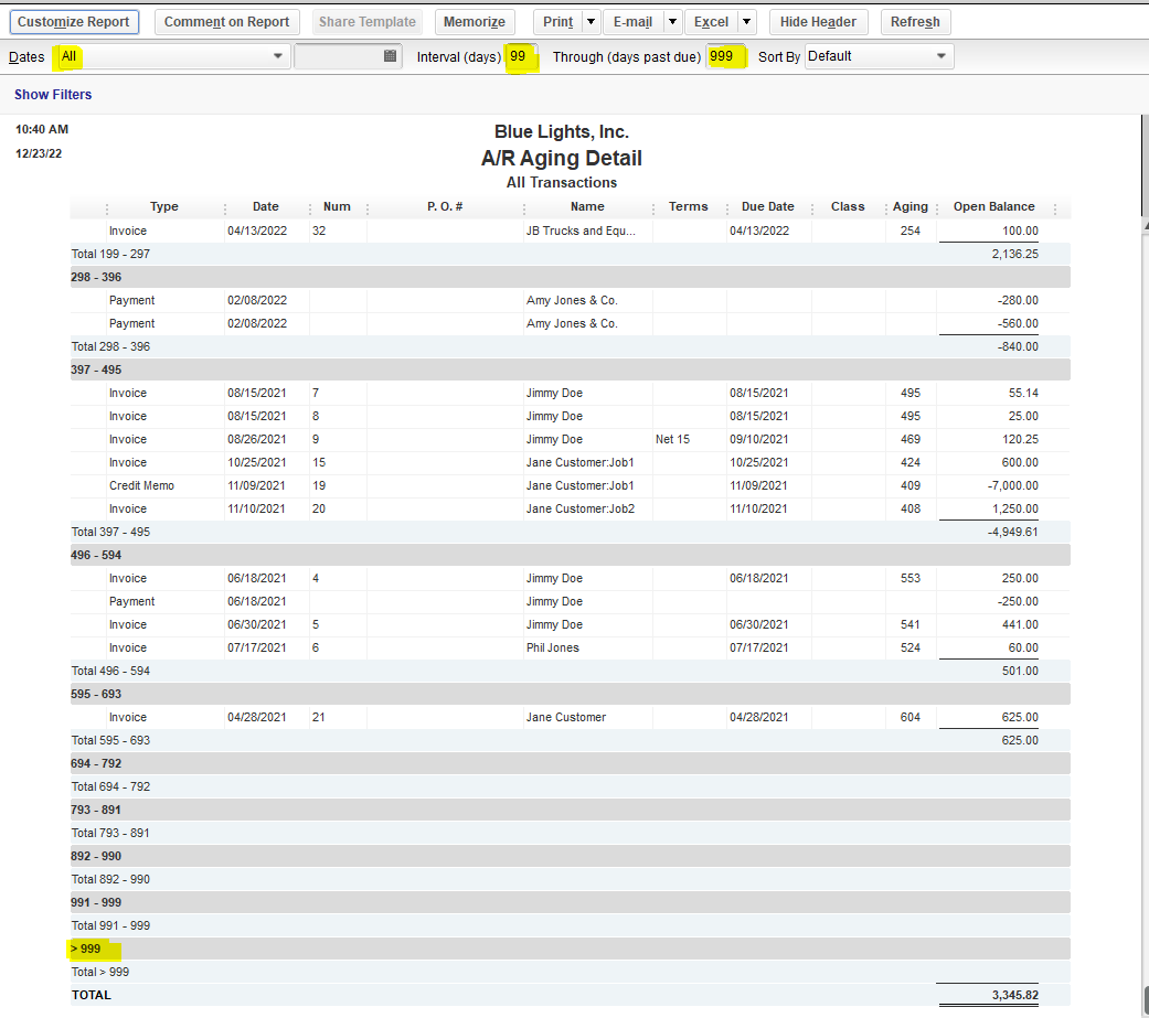 You can have a 30, 60, or 90-day interval. The maximum is 99 days, which can only be applied to transactions that have been overdue for 999 days. Anything older than that will be listed together without intervals.