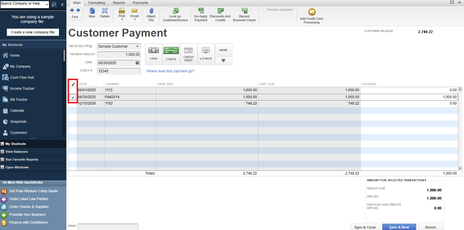 3. In the Receive Payment window, move the check mark from the invoice to the reversing journal entry.