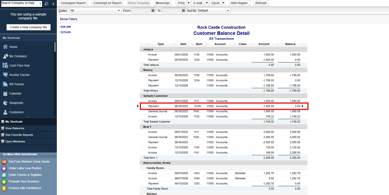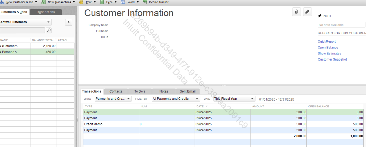 1. In the Customer Center, with the customer selected, look at the Transactions list.