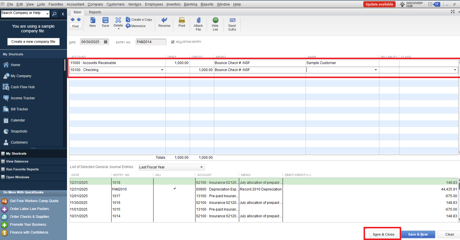2. In the General Entries window, debit your accounts receivable for the same amount of the NSF check.