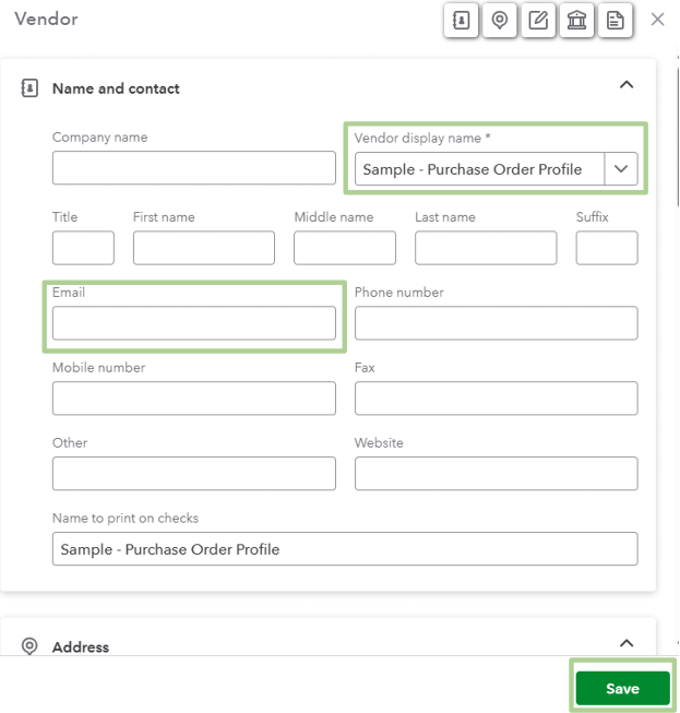 - Add the appropriate name in the Vendor display name field with a clear indicator to avoid confusion. For example, use Vendor Name - Purchase Orders and Vendor Name - Bill Pay.