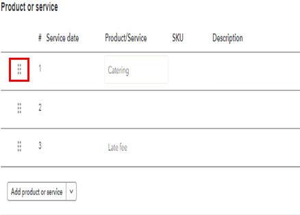 On the other hand, if you're using the old layout, you can see the + icon and add a line item by clicking the empty field in the Product/Service column. Also, know that you can drag it by clicking the icon beside the number and dragging it to the line item you'd want to put it in.