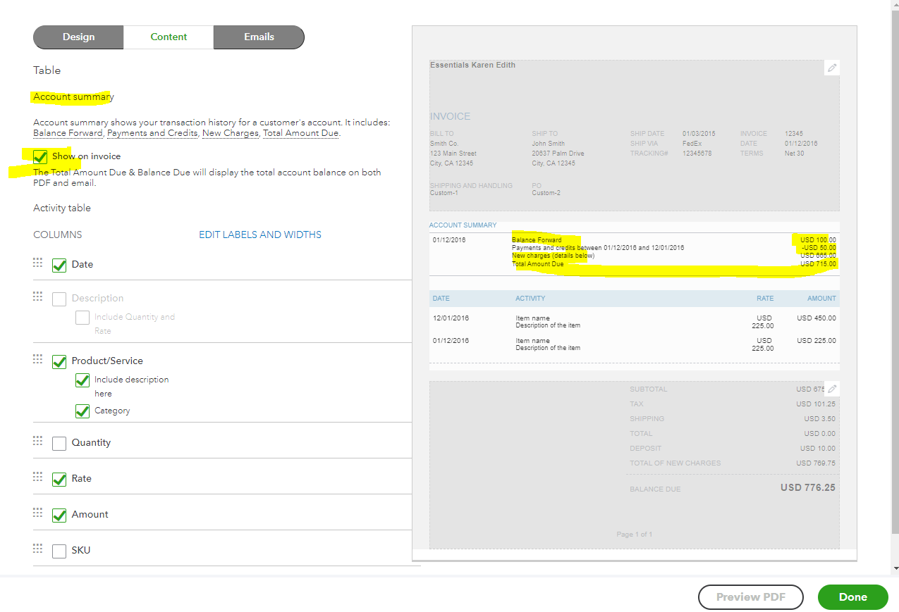 For further details, you can click this article: Add an account summary to an invoice in QuickBooks Online.