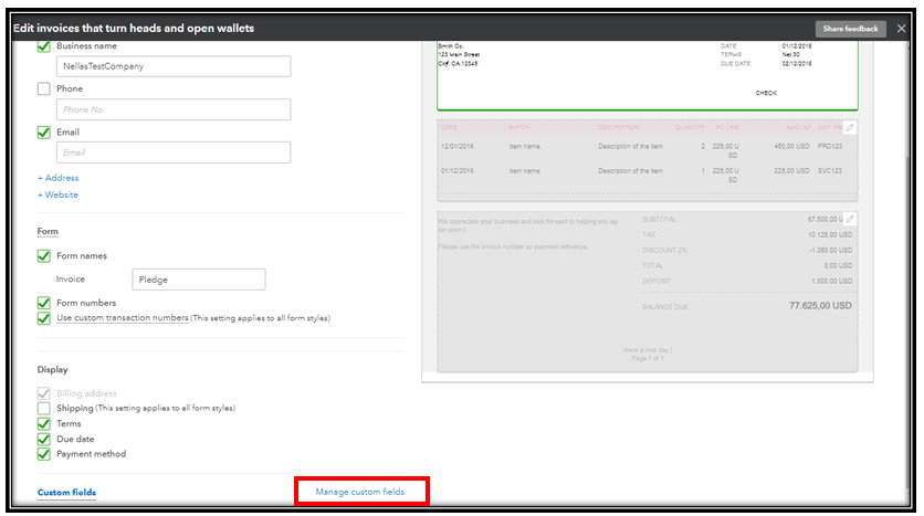 You have been, by far, the most helpful of all the people I have communicated with about this issue so I thank you. I have QBO Essentials which you listed as a subscription level that allows the customizing you're referring to. When I go to Manage Custom Fields, there is not a Data Type drop down box. I think you're suggestion would be a great solution but I don't have that option. I am wondering if there is a glitch somewhere because I have made several changes to the invoice, saved them and then not have them apply.