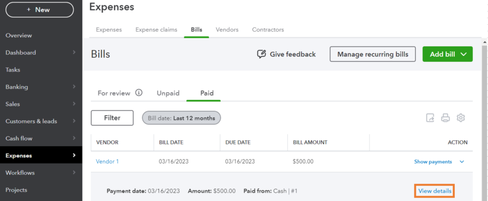 To view the payment details, you'll have to open the bill payment transaction link to the bill. Here's how: