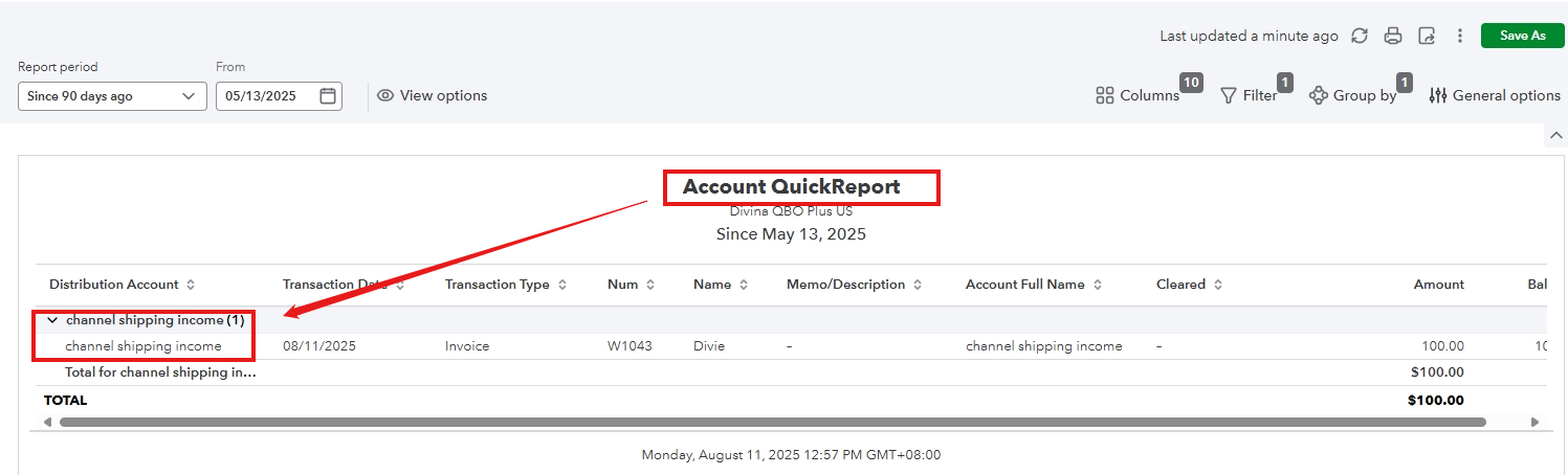 2.In the Account QuickReport Select the Channel Shipping Income account.