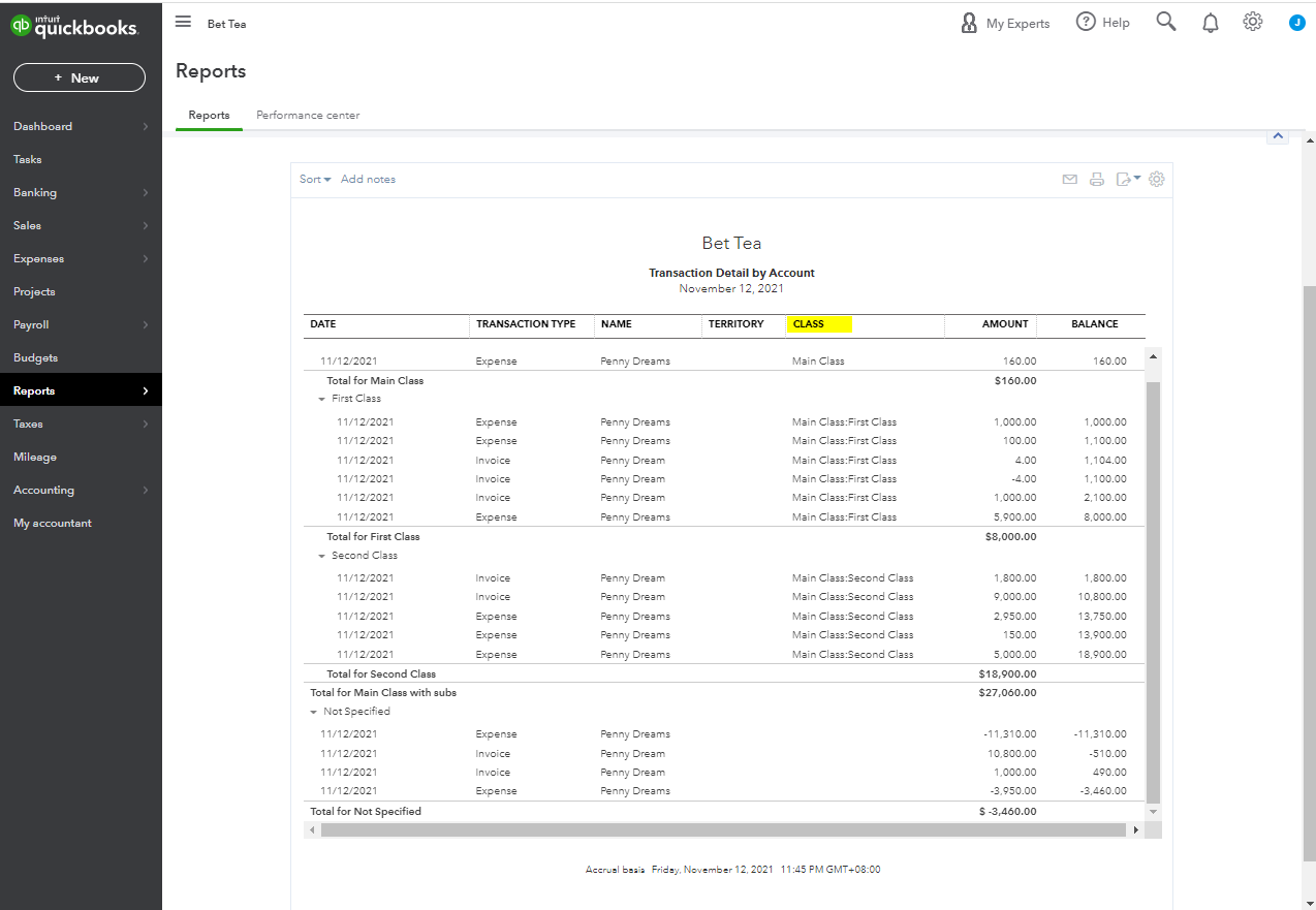 If you want a different report where you can see the main class with its sub-classes, you can use other reports like Transaction Detail by Account. This is how it looks like when you run the report by class: