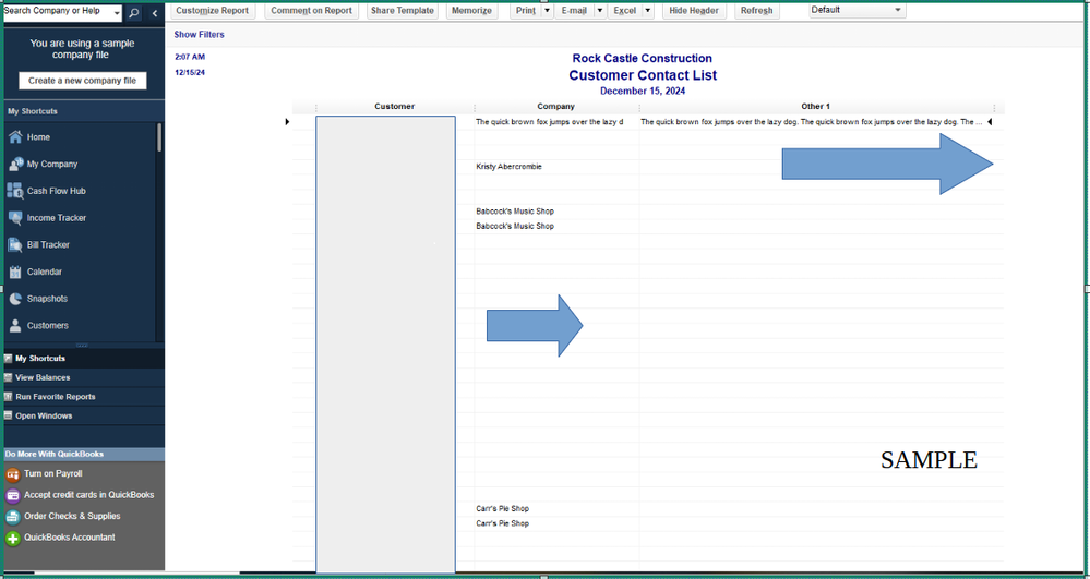 To view all customer company names in your report, simply drag the column to expand it. This will allow you to see the full names instead of just partial entries. Let me show you how it works.