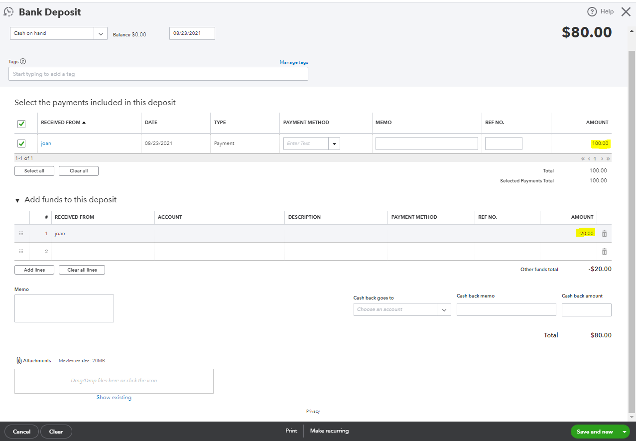 Once done, make a bank deposit and create a negative amount on the Add funds to this deposit column to balance what you receive in your Paypal account.