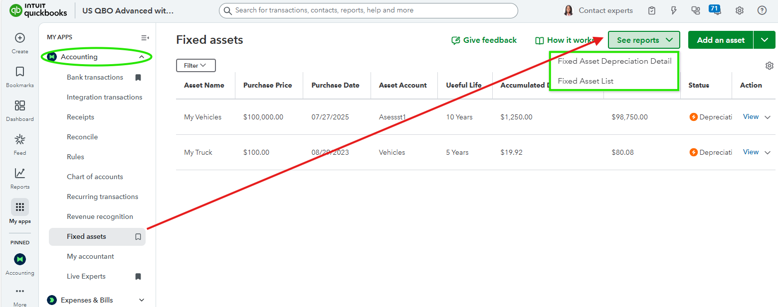 - On the Fixed assets page, select the dropdown arrow next to See reports.