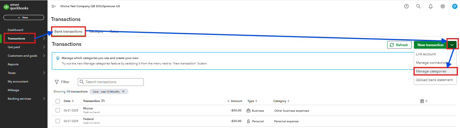 - Click the dropdown next to New transaction.