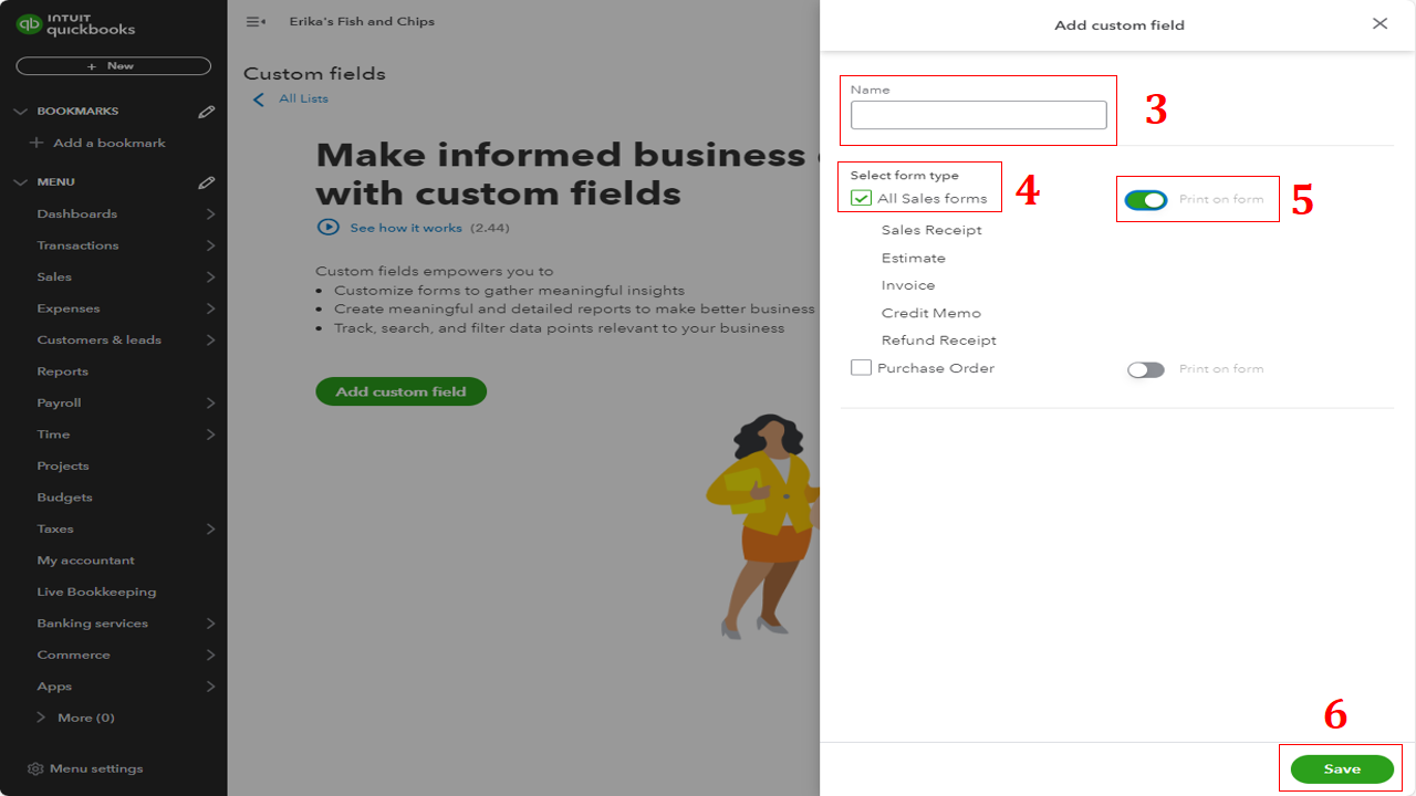 Currently, adding an email address and phone number to your invoices isn't available in QuickBooks Online (QBO). However, we can use the custom field functionality to complete this process. You can only create three custom fields on sales forms in QuickBooks Online Plus and Essentials. In Plus, you can only create three custom fields for purchase orders.
