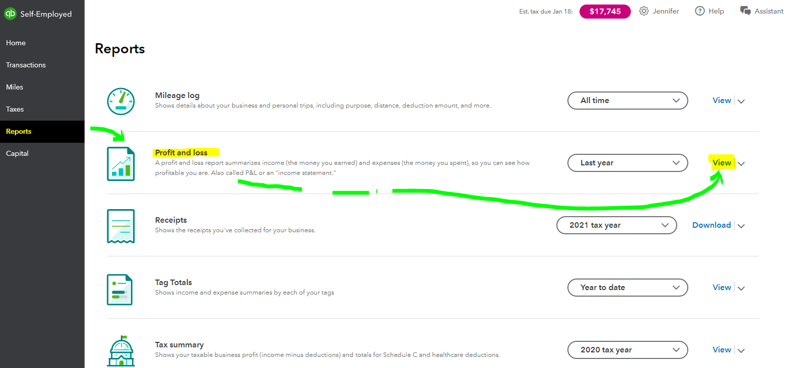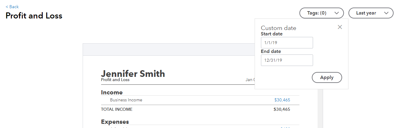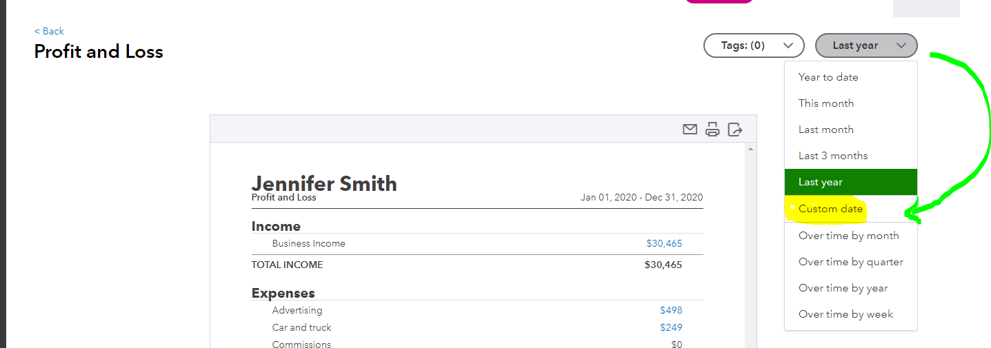 When you go to the Reports menu and view the Profit and Loss report, you can click the Date button on the top right. Select the Custom date from the drop-down list to change the beginning and ending dates.